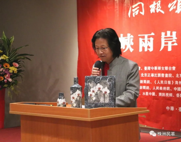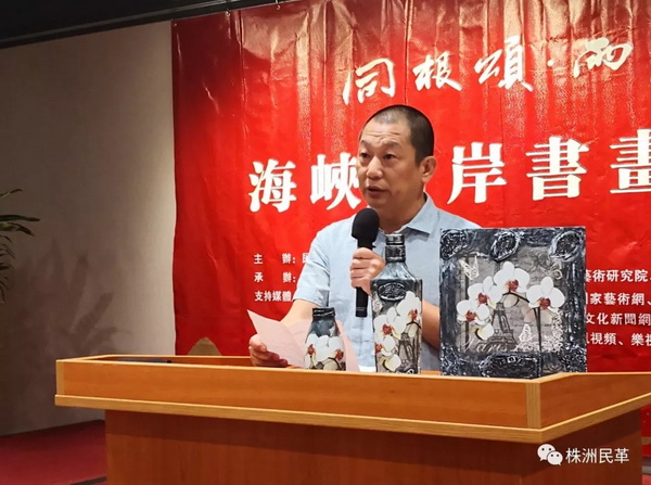 台湾中华妇女联合会理事长何建华女士致欢迎词,民革湖南省株洲市荷塘工委主委谭光明先生代表民革株洲市委致辞,北京正举沈鹏书画院院长沈鹏教授致贺辞,株洲民革书画院院长钟正午教授介绍展览筹备情况,台湾中华统一促进党张馥堂主席、台湾中国书法学会理事长叶国华先生、台湾中华畅庐书法学会理事长吴朝沧先生、株洲市书法家协会副主席刘湘清先生先后在开幕式上讲话。